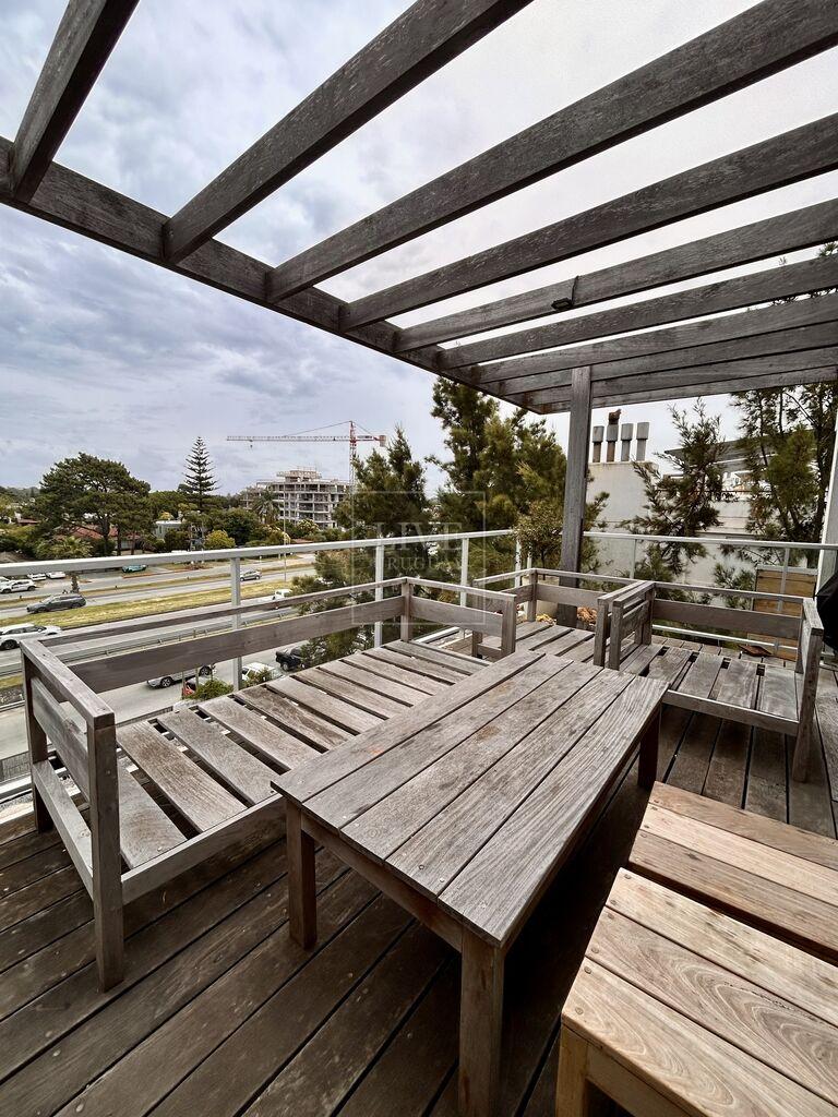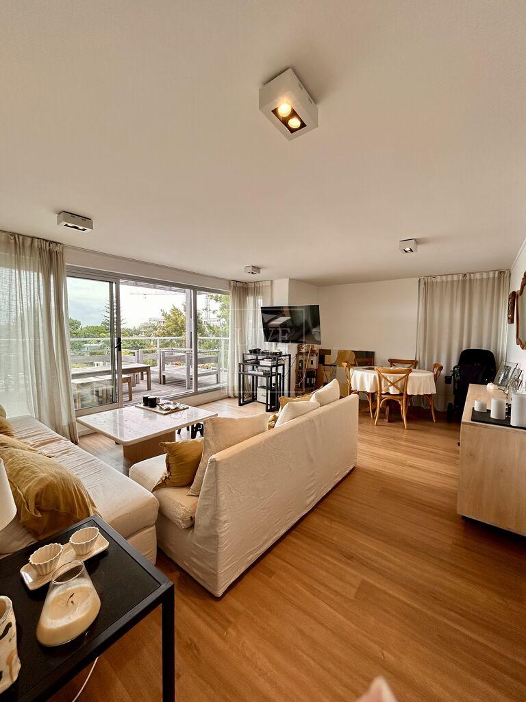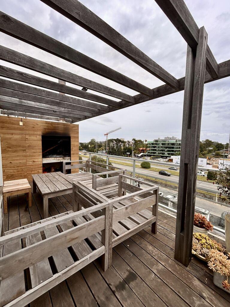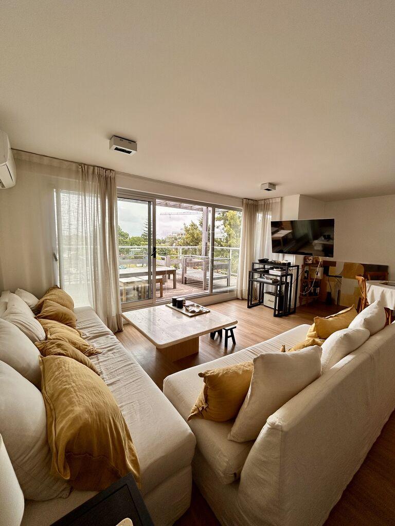 Living comedor con salida a terraza con piso lapacho y parrillero.