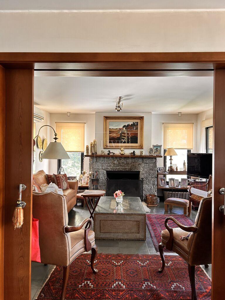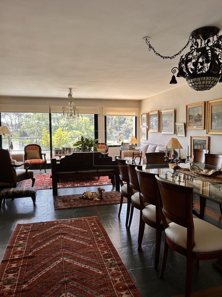Living comedor amplio con vista al lago. Muy lindo Estar con estufa a leña, unido al living con puertas corredizas .